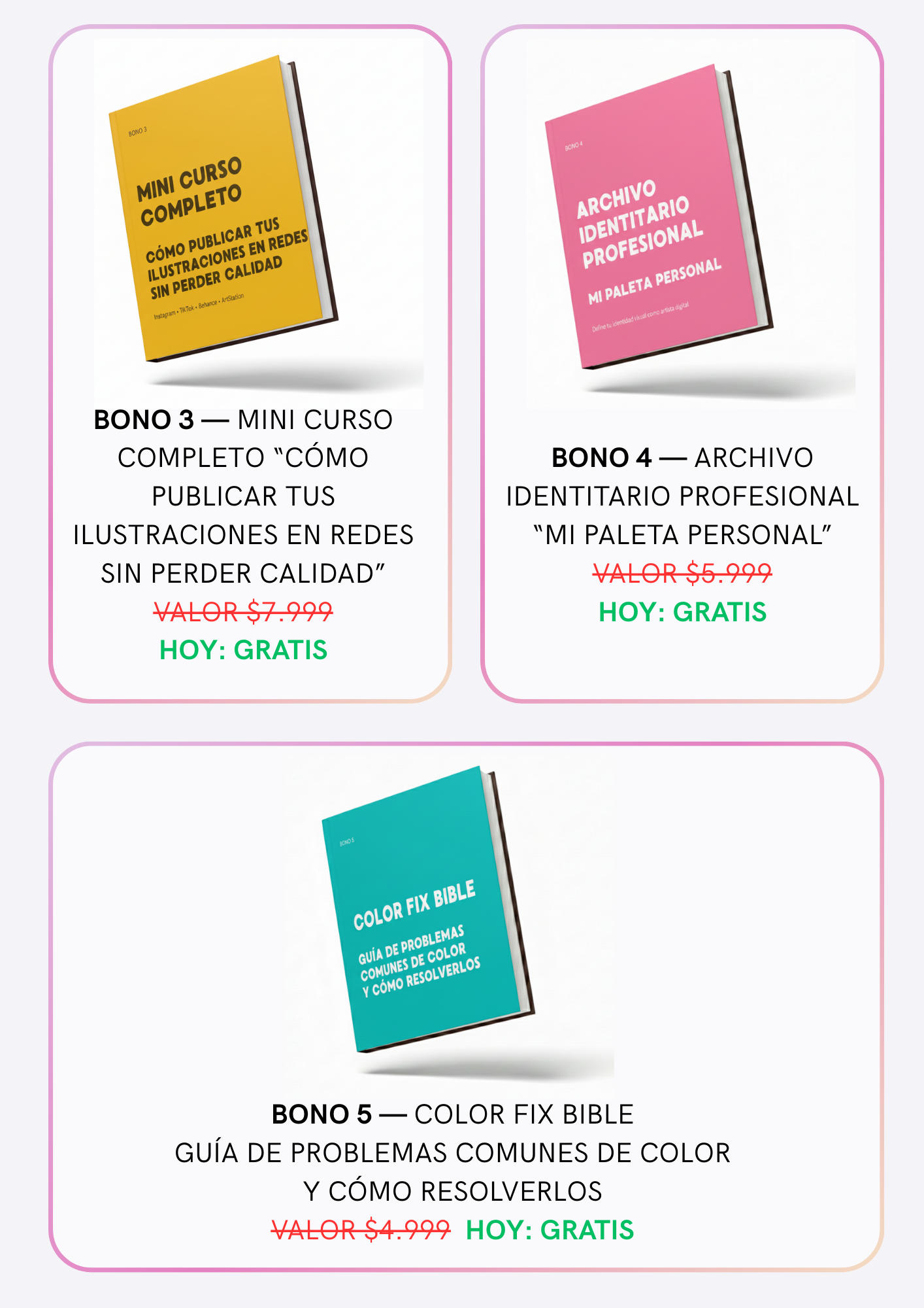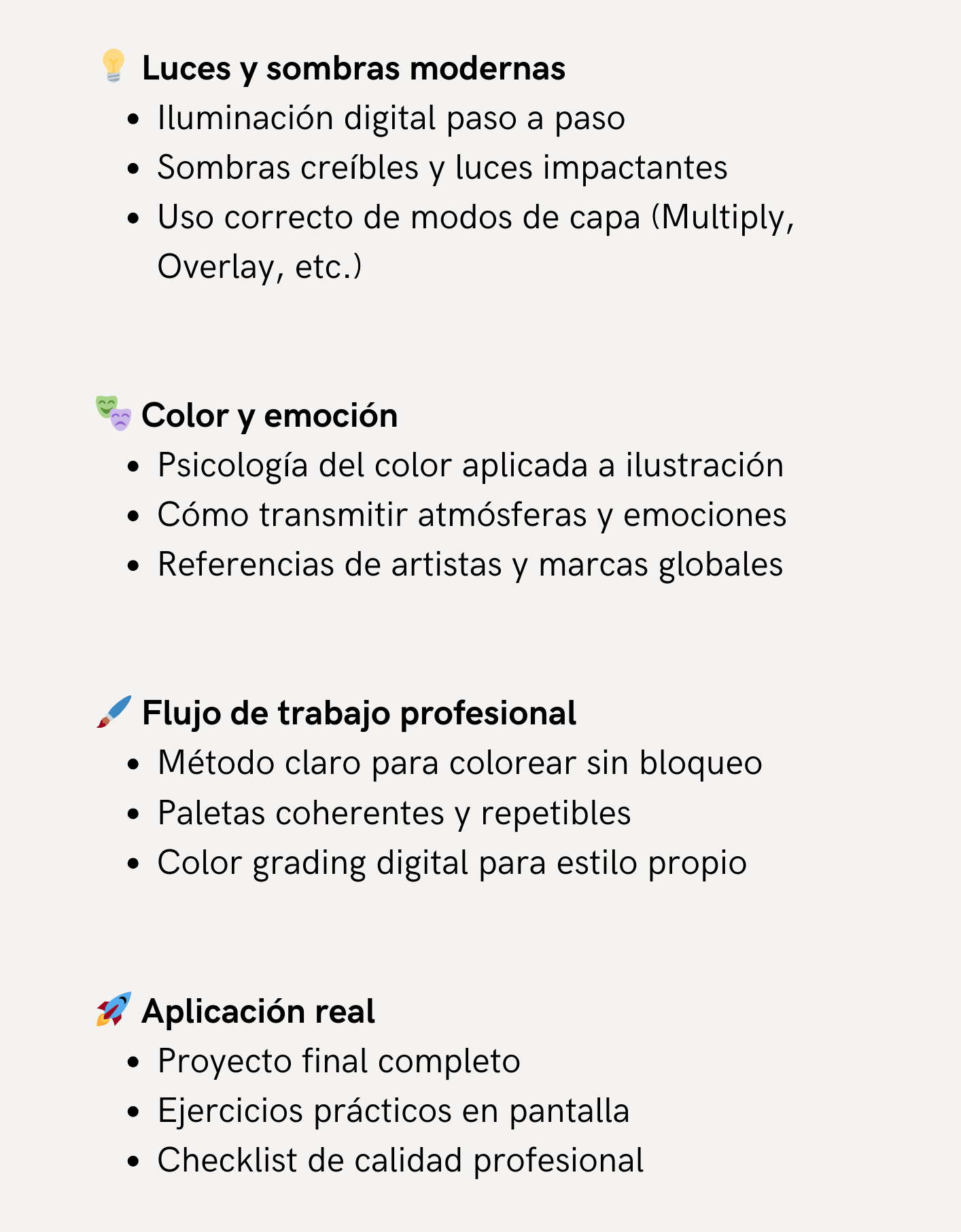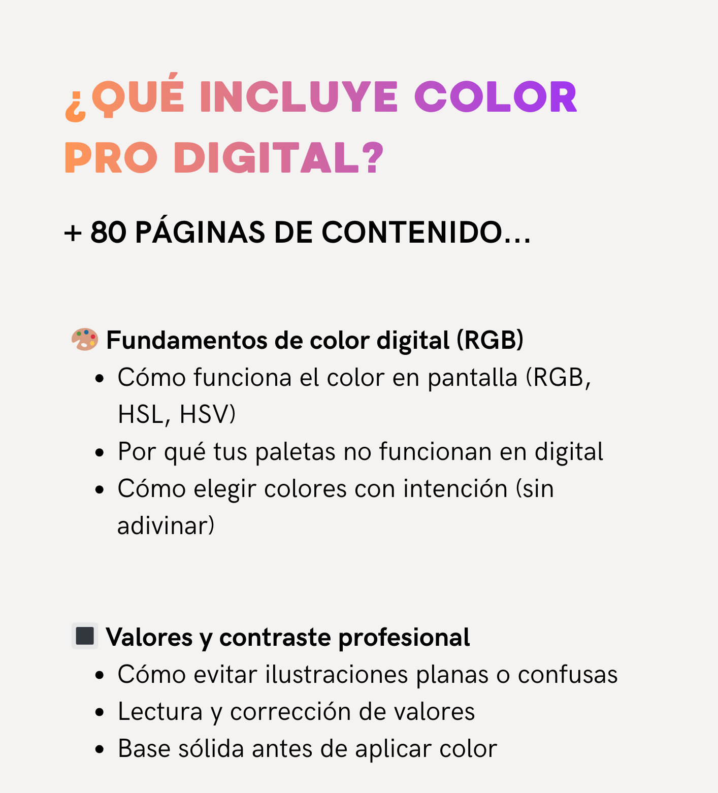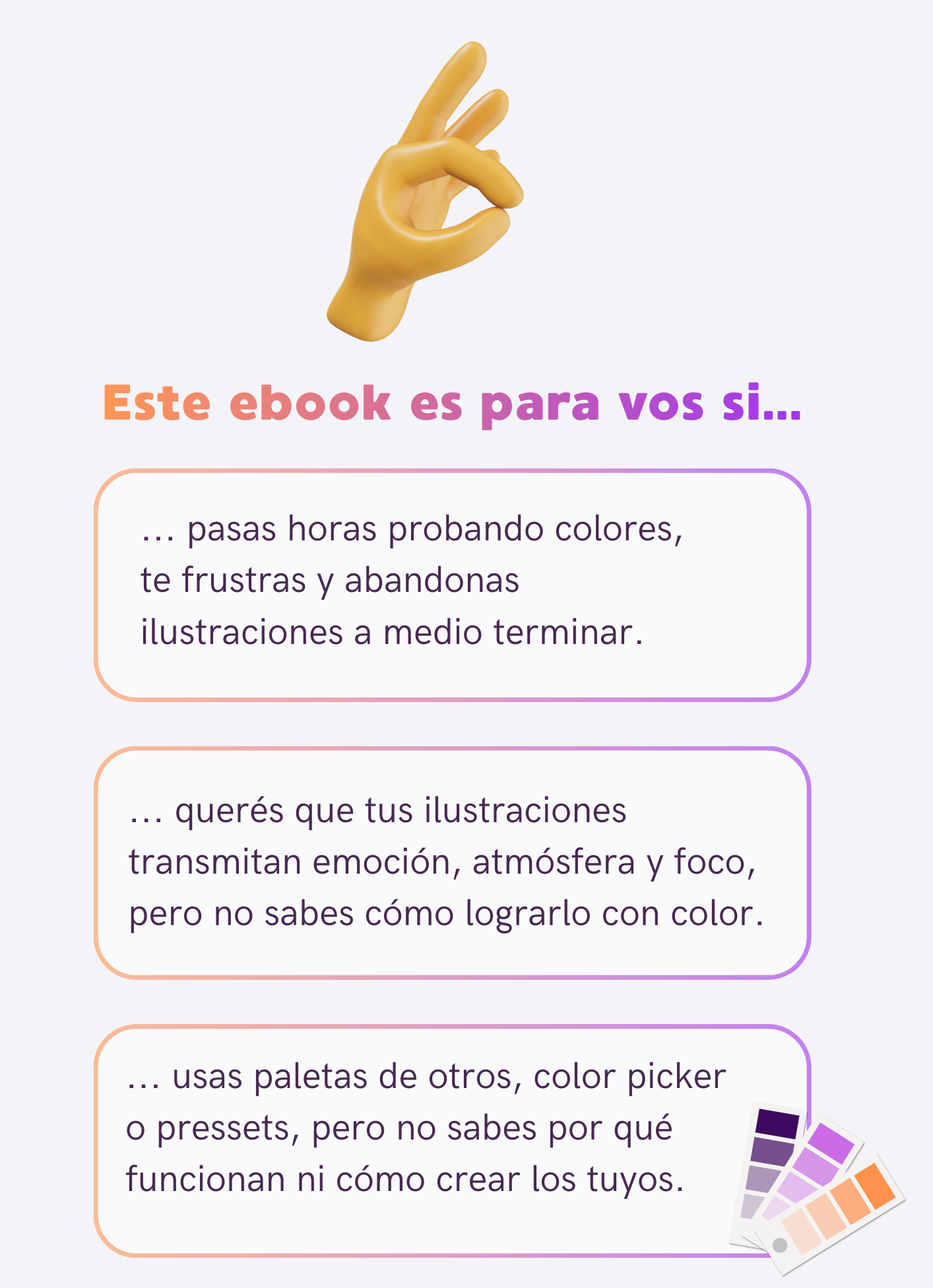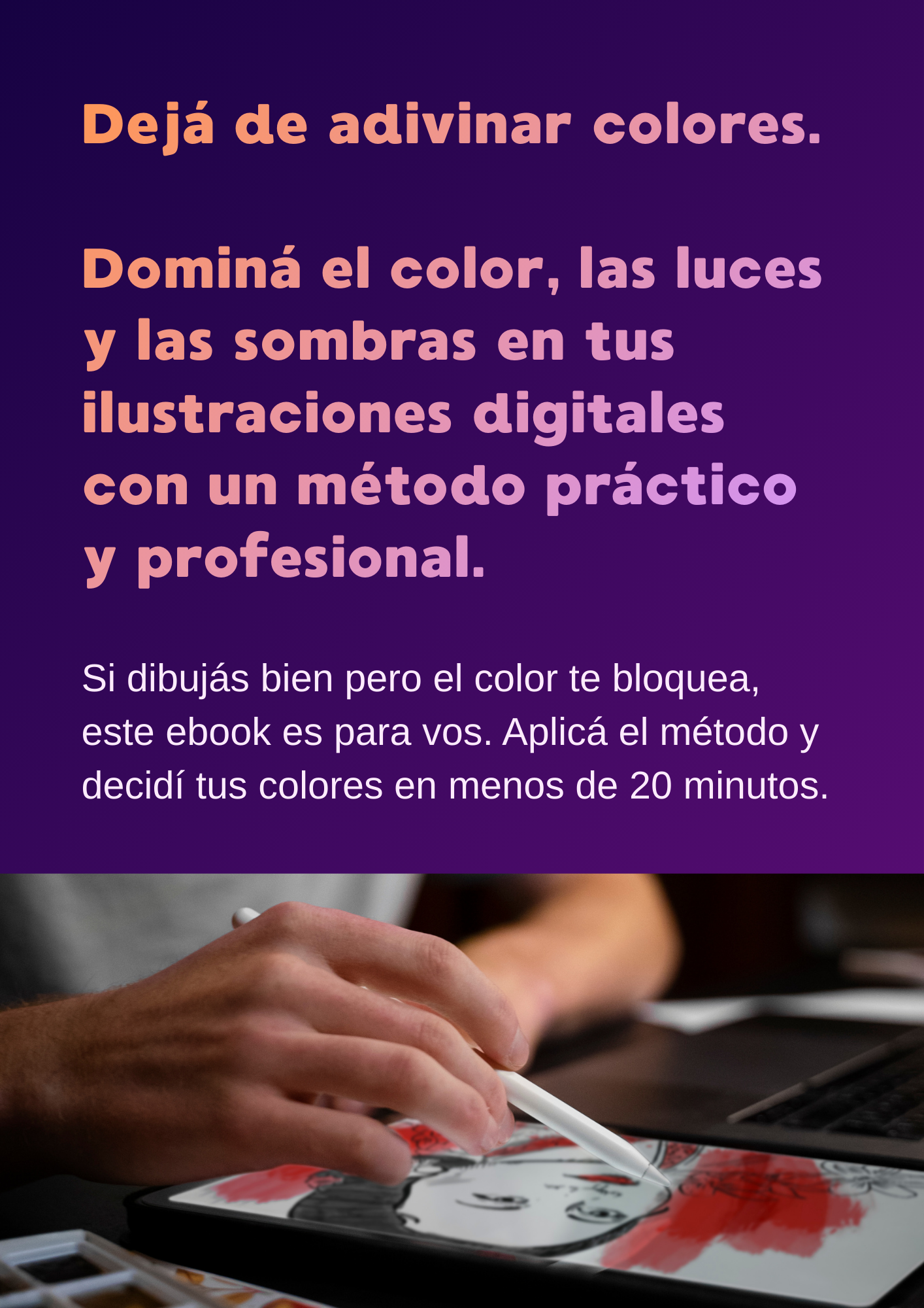 “Ya sabía teoría del color, pero me costaba aplicarla. Este ebook me dio un paso a paso claro para decidir paletas a conciencia. Entender que las luces y sombras llevan color lo cambio todo!”